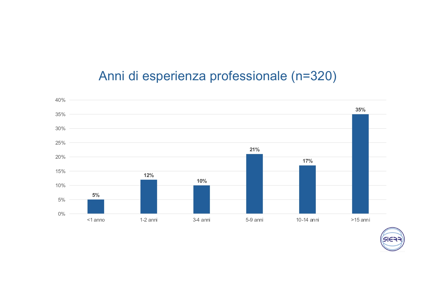L’indagine ha evidenziato come la maggior parte degli embriologi clinici sia composta da professionisti giovani, con il 44% degli intervistati di età compresa tra i 30 e i 40 anni, e un ulteriore 10% sotto i 30 anni. Al contempo, emerge una percentuale significativa di professionisti con un’esperienza consolidata, con il 35% degli intervistati che vanta più di 15 anni di esperienza nel settore. Questa distribuzione demografica e di esperienza professionale suggerisce che la professione stia vivendo una fase di rinnovamento, con l’ingresso di giovani biologi, ma anche con una solida presenza di esperti, che costituiscono una risorsa fondamentale per il settore.