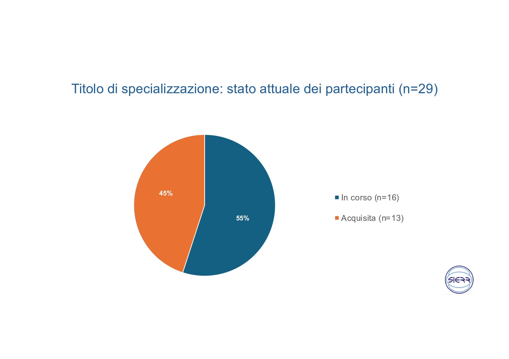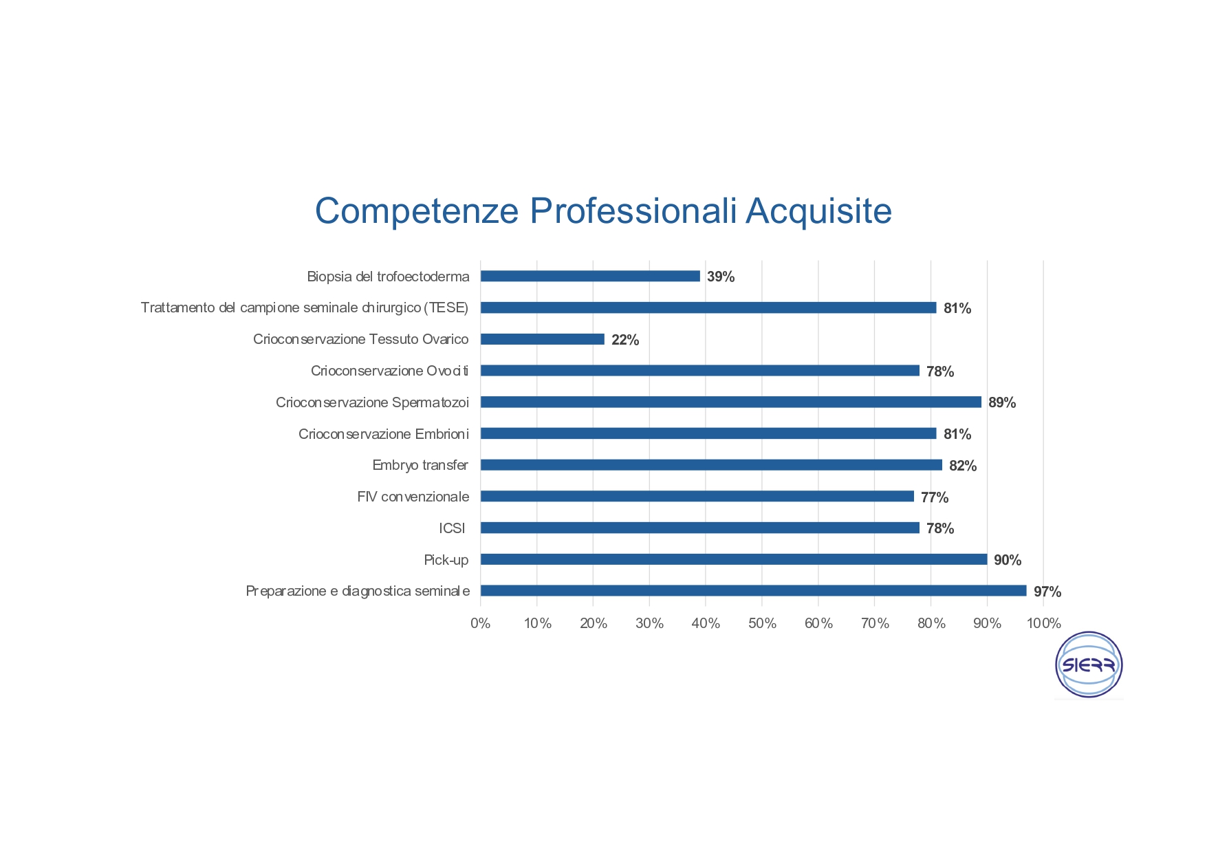 Riguardo alle competenze acquisite, oltre il 75% degli intervistati ha dichiarato di possedere una preparazione elevata in molte delle principali aree dell’embriologia clinica, come il trattamento del campione seminale chirurgico, la crioconservazione di gameti ed embrioni, l’ICSI, l’embryo transfer e la diagnostica seminale. Tuttavia, alcune competenze più specialistiche, come la crioconservazione del tessuto ovarico (22%) e la biopsia del trofoectoderma (39%), risultano meno diffuse, indicando che queste aree sono ancora in fase di sviluppo e richiedono un’ulteriore attenzione, sia a livello formativo sia pratico.
