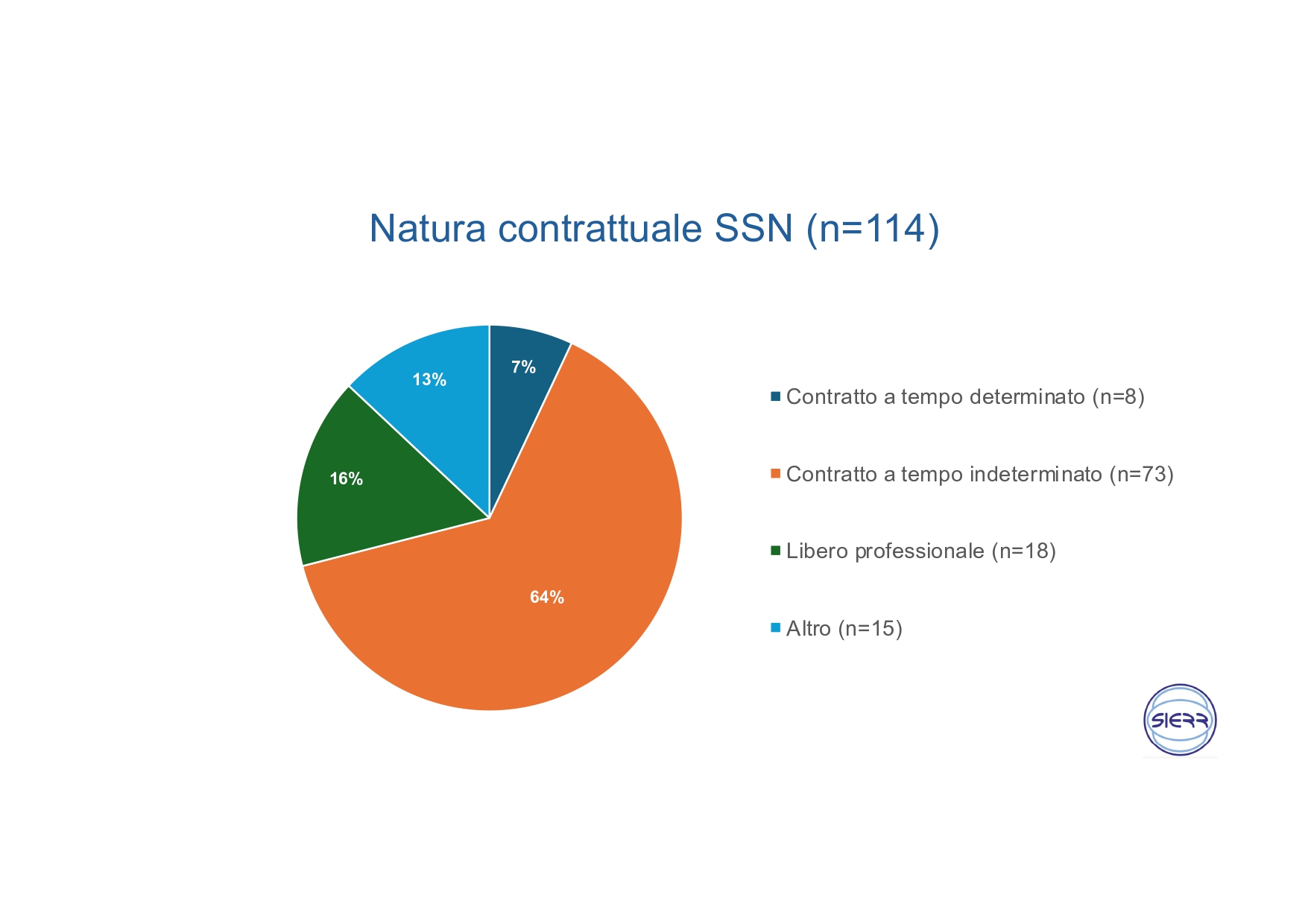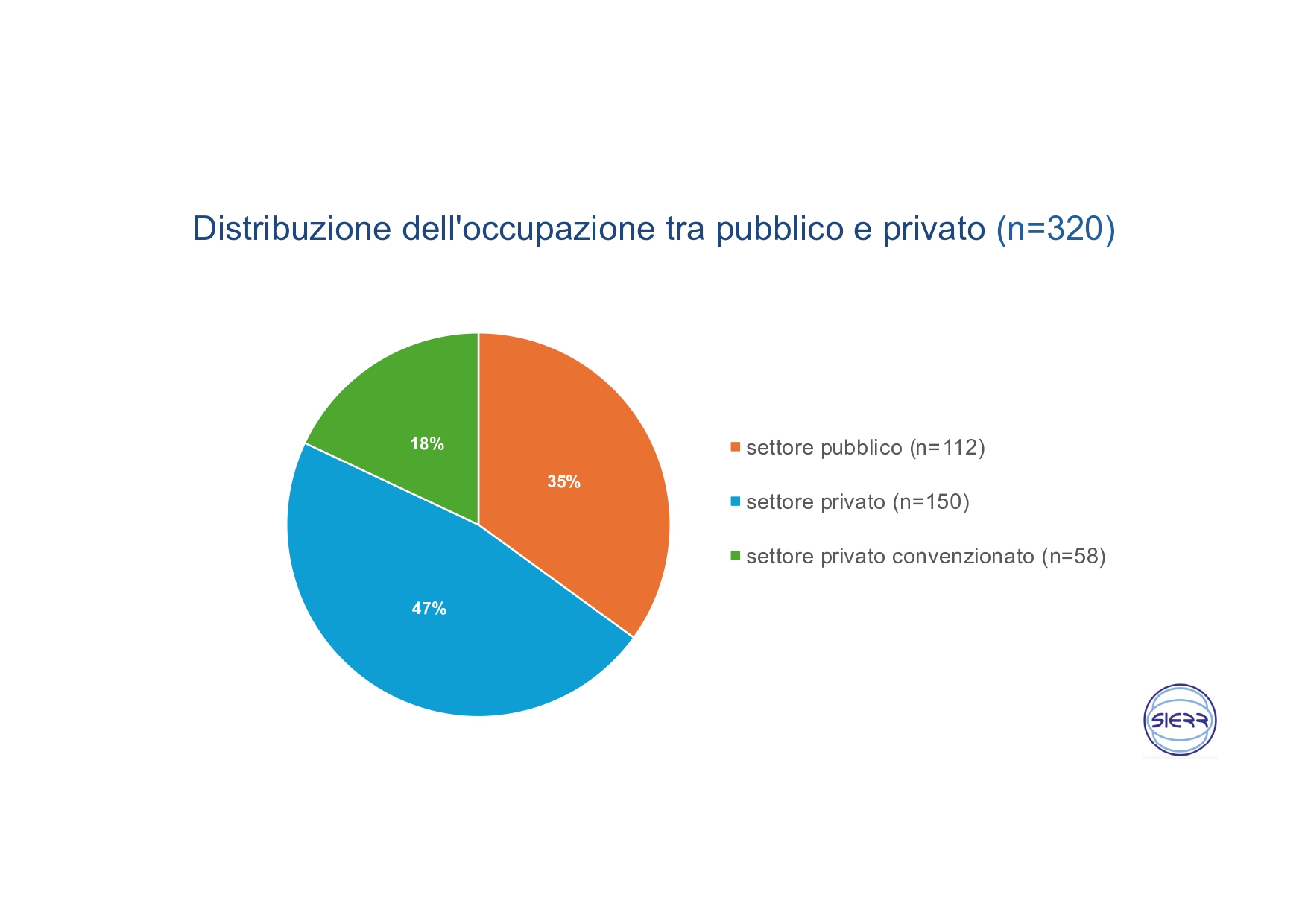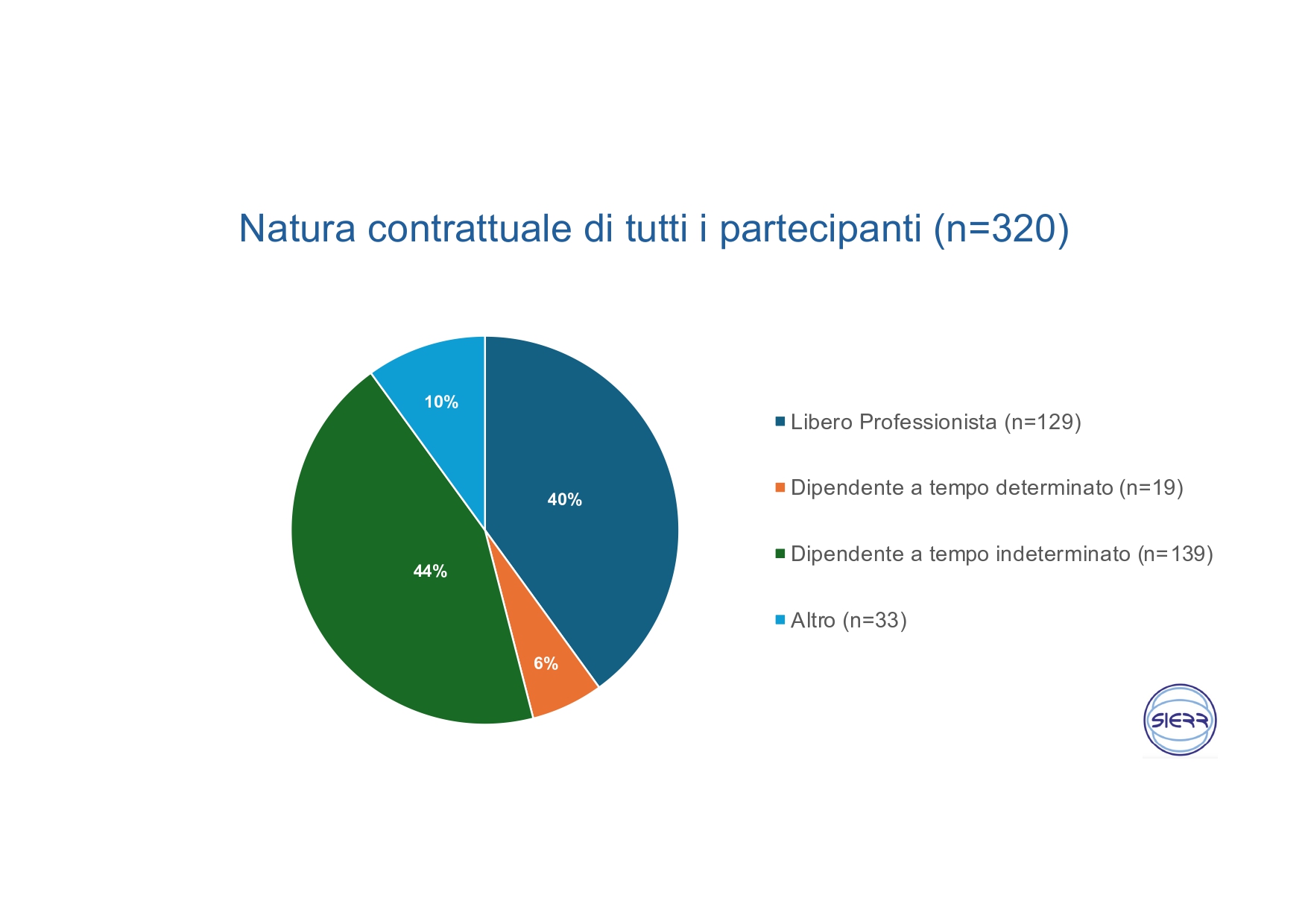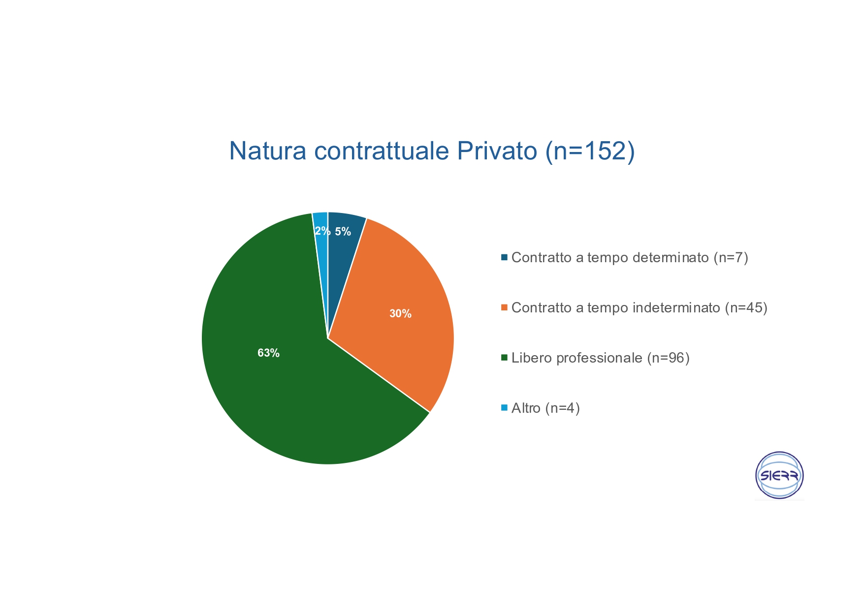 Un aspetto che emerge con particolare rilevanza è quello legato alla tipologia di impiego degli embriologi clinici. Il 47% degli intervistati è impiegato nel settore privato, mentre il 35% lavora nel settore pubblico e il 18% nel privato convenzionato. Sebbene la diversificazione dei settori di impiego dimostri la flessibilità della professione, i dati relativi alla tipologia di contratto sono preoccupanti. Il 40% degli intervistati lavora come libero professionista, una percentuale che raggiunge livelli critici nel settore privato, dove oltre il 60% degli embriologi è impiegato con contratti libero professionale. Questo dato riflette una crescente precarizzazione del lavoro, con un’incidenza significativa di contratti non stabili, in particolare nel settore privato, dove il ricorso a contratti a tempo indeterminato è ridotto al 30%. Al contrario, nel settore pubblico la percentuale di contratti a tempo indeterminato raggiunge il 64% ma anche in questo caso il lavoro libero professionale è presente in modo rilevante, con il 16% degli embriologi che operano come liberi professionisti anche nel Servizio Sanitario Nazionale.