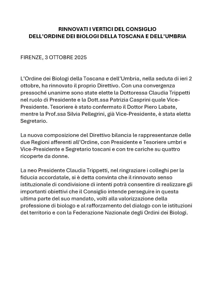 L’Ordine dei Biologi della Toscana e dell’Umbria, nella seduta di ieri 2 ottobre, ha rinnovato il proprio Direttivo. Con una convergenza pressoché unanime sono state elette la Dottoressa Claudia Trippetti nel ruolo di Presidente e la Dott.ssa Patrizia Casprini quale Vice-Presidente. Tesoriere è stato confermato il Dottor Piero Labate, mentre la Prof.ssa Silvia Pellegrini, già Vice-Presidente, è stata eletta Segretario.
