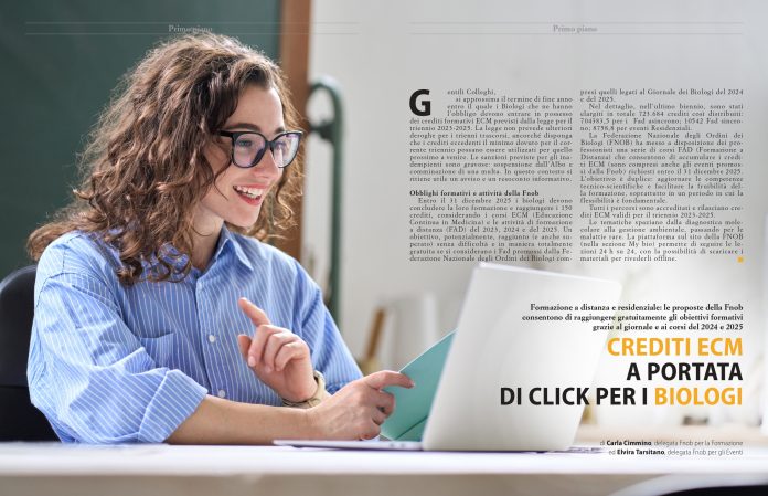 La dottoressa Carla Cimmino, delegata Fnob per la Formazione, e la dottoressa Elvira Tarsitano, delegata Fnob agli Eventi, hanno scritto l’articolo “Crediti Ecm a portata di click per i biologi”, che sarà pubblicato nel prossimo numero del Giornale dei Biologi, in uscita a fine novembre.