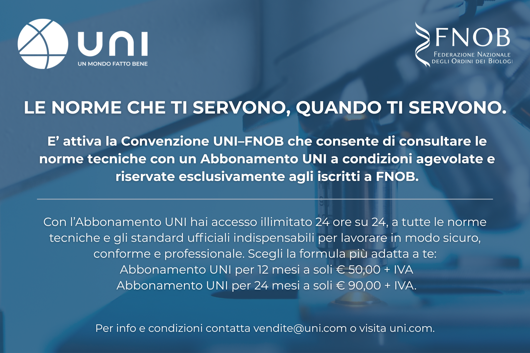 Grazie alla nuova convenzione sottoscritta tra UNI – Ente Italiano di Normazione e FNOB – Federazione Nazionale degli Ordini dei Biologi tutti i biologi regolarmente iscritti alla Federazione potranno accedere in modo semplice, completo e agevolato alle norme tecniche e agli standard, fondamentali per l’esercizio consapevole e aggiornato della professione.