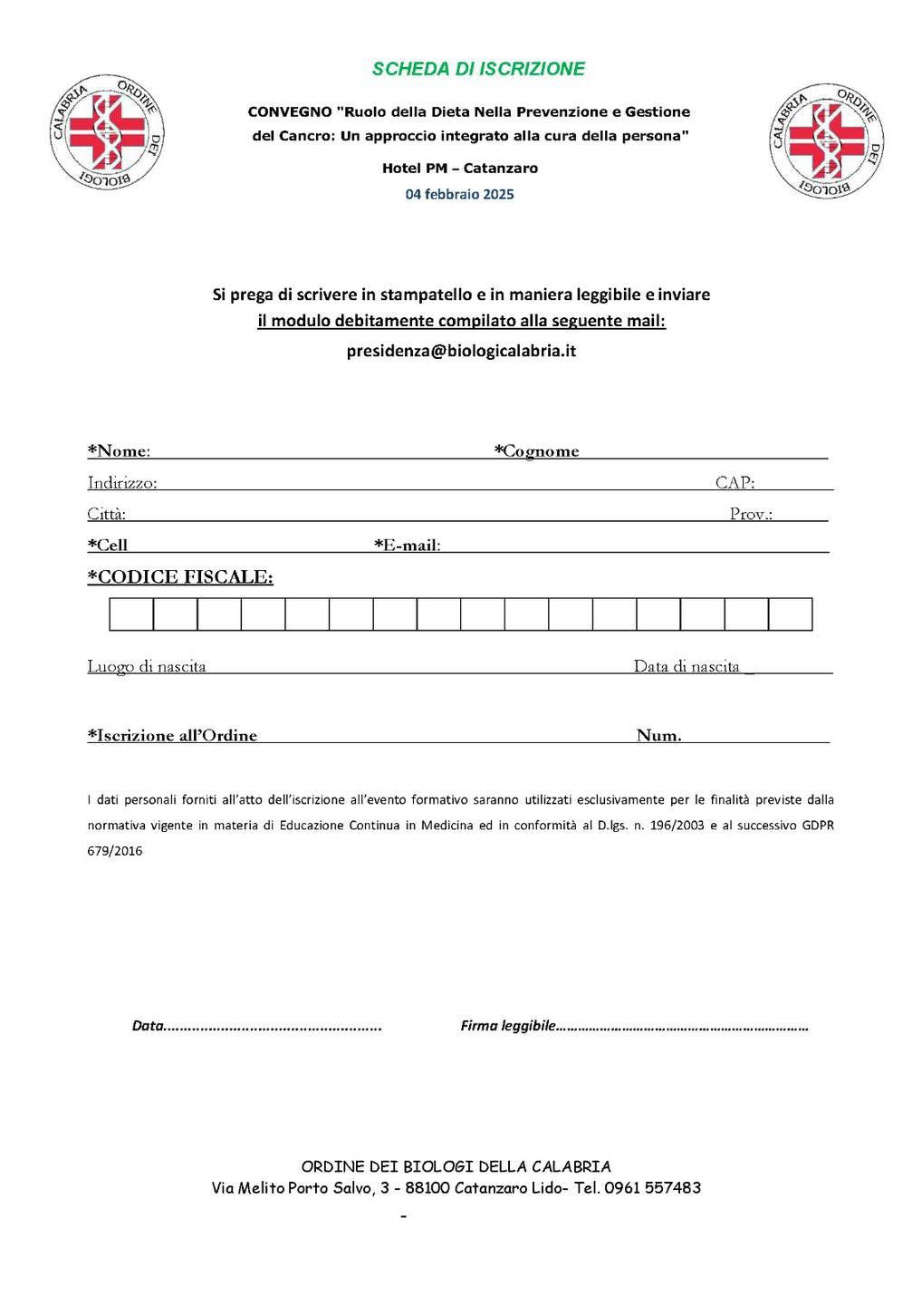 L’evento, gratuito e accreditato con 5 crediti ECM, è organizzato dalla Commissione Alimentazione e Nutrizione dell’Ordine dei Biologi della Calabria, in collaborazione con l’Associazione Biologi Nutrizionisti Calabresi (ABNC) e l’Associazione Italiana Biologi (AIB), con l’obiettivo di valorizzare un approccio multidisciplinare e integrato alla prevenzione e alla gestione della patologia oncologica.