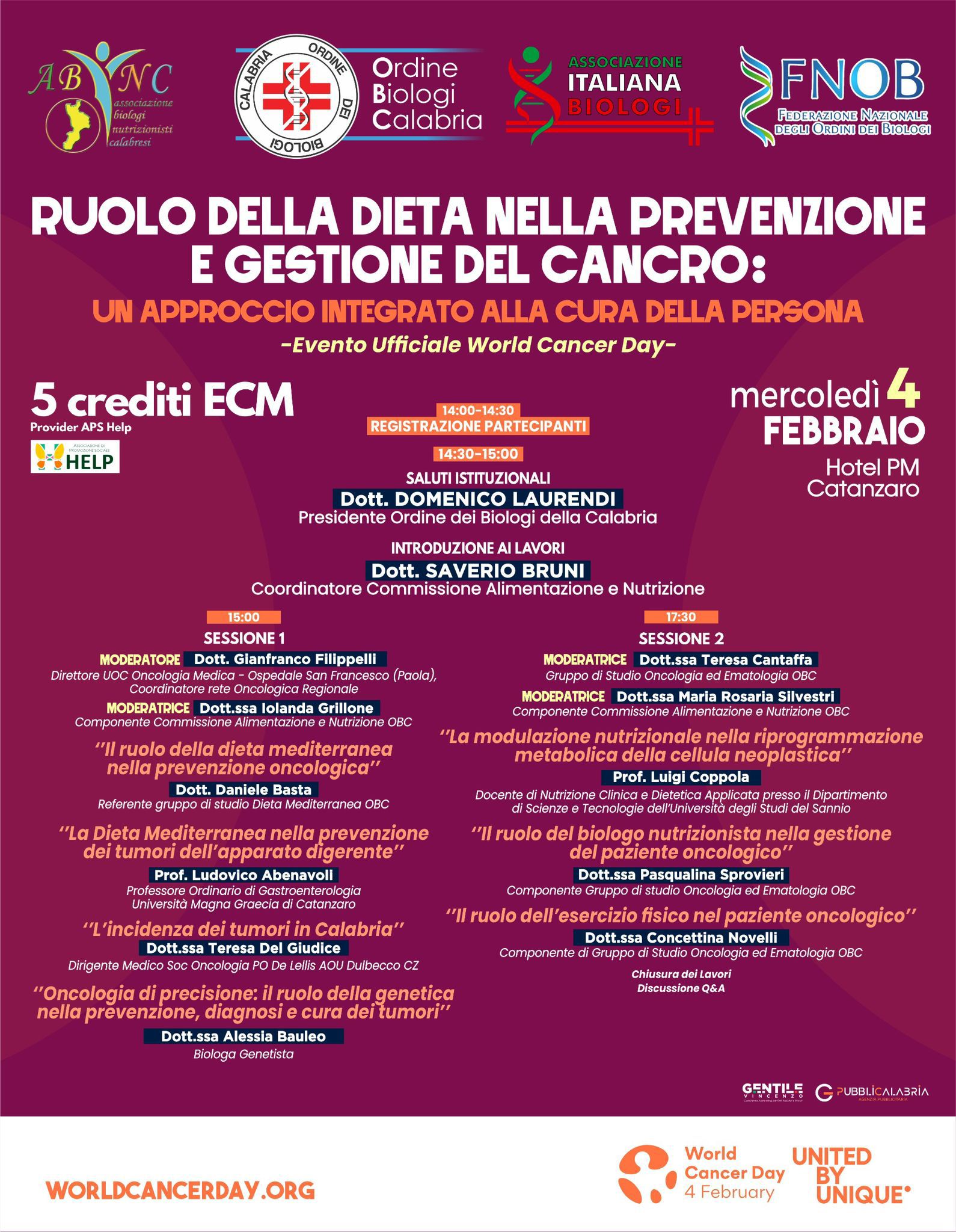 Il 4 febbraio, in occasione del World Cancer Day, la città di Catanzaro ospiterà presso l’Hotel PM l’evento scientifico “Ruolo della Dieta nella Prevenzione e Gestione del Cancro: un approccio integrato alla cura della persona”, un appuntamento di grande rilievo scientifico e istituzionale organizzato dai biologi calabresi. L’iniziativa rappresenta l’unico evento del sud Italia e uno dei pochissimi presenti in tutta Italia ufficialmente registrati sulla piattaforma internazionale del World Cancer Day, elemento che ne conferma l’alto valore e la piena adesione ai messaggi globali di prevenzione, consapevolezza e accesso alle cure promossi a livello mondiale.