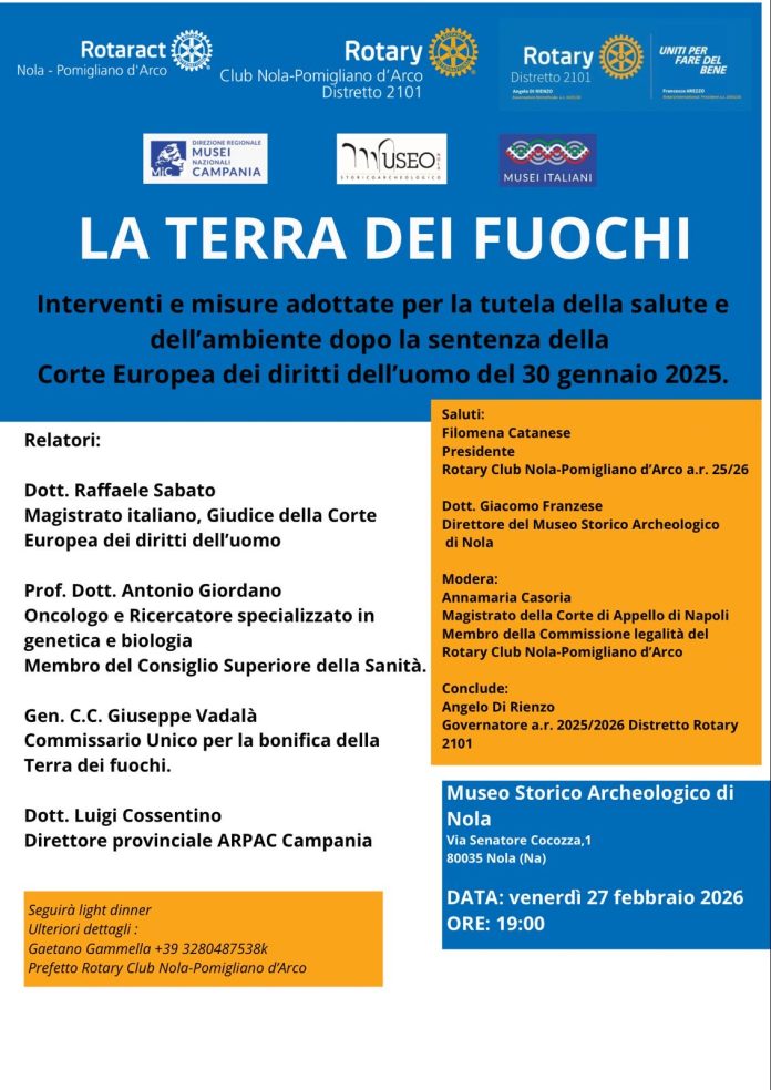 Il 27 febbraio 2026, nel Museo Storico Archeologico di Nola (Napoli), si terrà l’incontro dal titolo “La Terra dei fuochi. Interventi e misure adottate per la tutela della salute e dell’ambiente dopo la sentenza della Corte europea dei diritti dell’uomo del 30 gennaio 2025”.