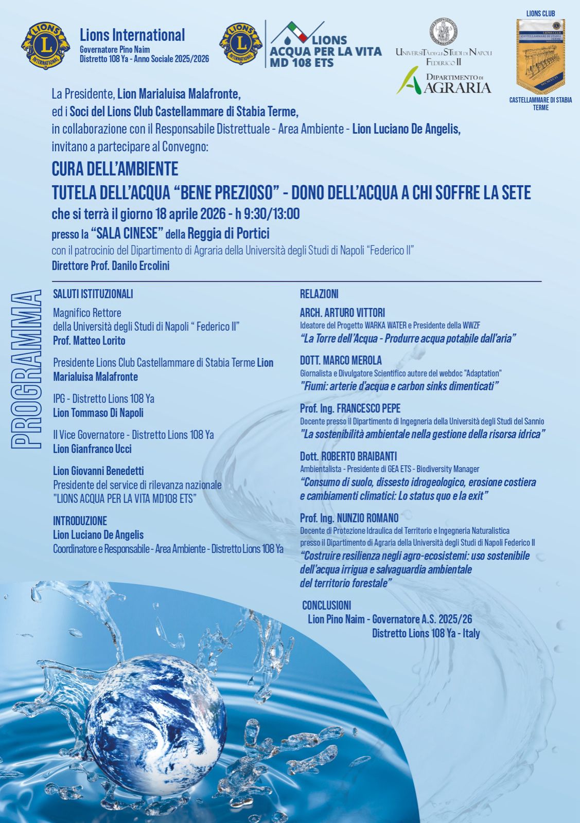 Il Lions Club Castellammare di Stabia Terme organizza il convegno “Cura dell’ambiente: tutela dell’acqua “bene prezioso”